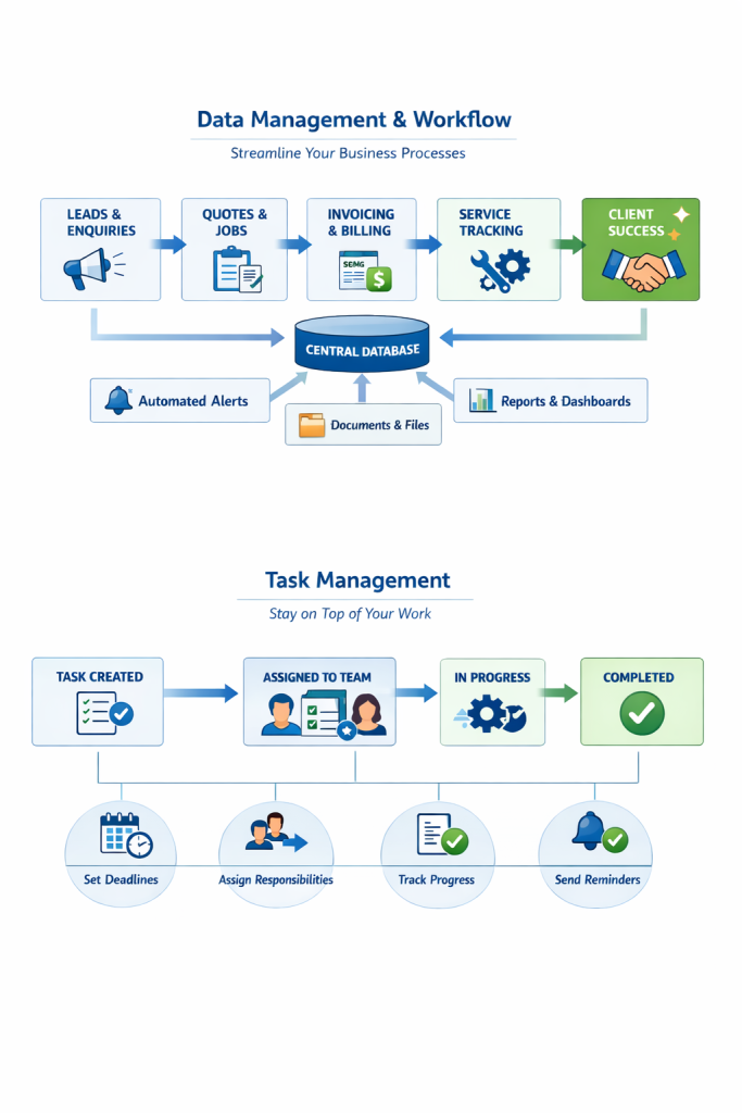 It brings sales, operations, service delivery, and financial touchpoints into one simple system, designed around how your business actually works.